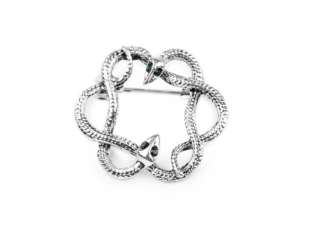 Metalowa broszka z przeplecionymi wężami zachwyca dyskretną elegancją. Oczy są ozdobione drobnymi szlifowanymi kamyczkami. Przyda się do codziennego noszenia i na uroczyste okazje. Z tyłu znajduje się szpilka broszkowa.