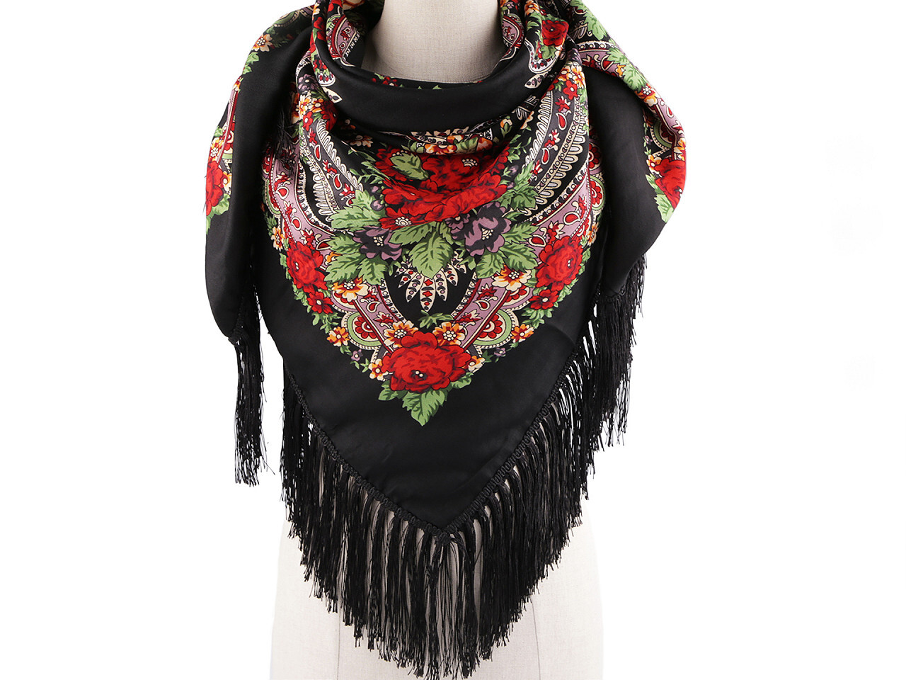 Šátek folklór květy s třásněmi 105x105 cm - 1 ks - 7 černá