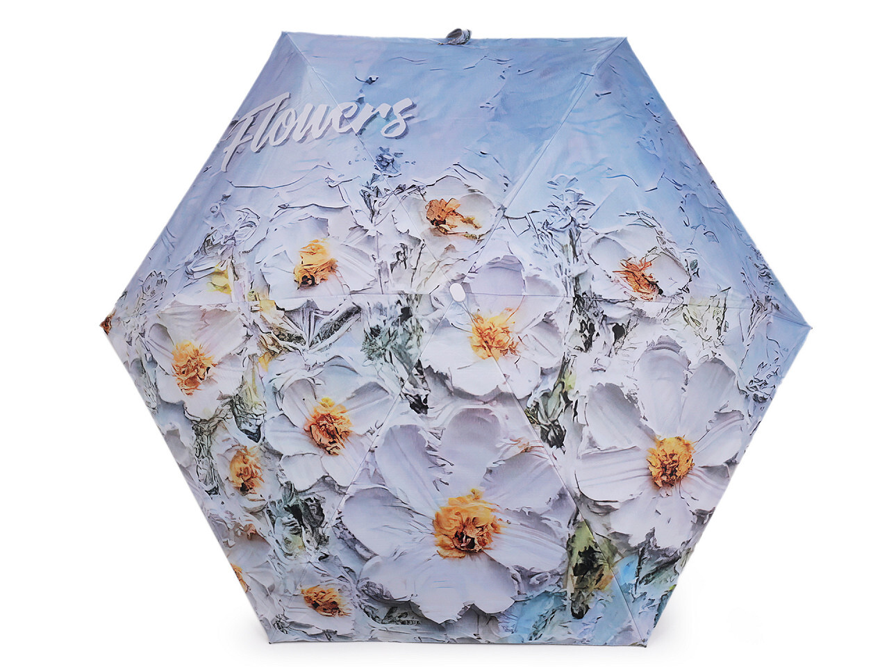 Składany mini parasol ma pokrycie z motywem dużych kwiatów. Dzięki aluminiowej konstrukcji i niewielkim rozmiarom jest lekki i poręczny, wygodnie zmieści się w torebce, po włożeniu do pokrowca ma płaski kształt. Konstrukcja parasola składa się z 6 pól. Filtr UV ochroni Cię przed promieniowaniem słonecznym. Rączka parasola jest plastikowa, wyposażona w pętlę.