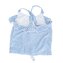 Dívčí tílko na ramínka a překřížením na zadní straně. Tílko má kolem lemu volánek, je doplněno o knoflíky a na spodní straně je mašle. V bílé barvě s modrými proužky. przeczytaj całość