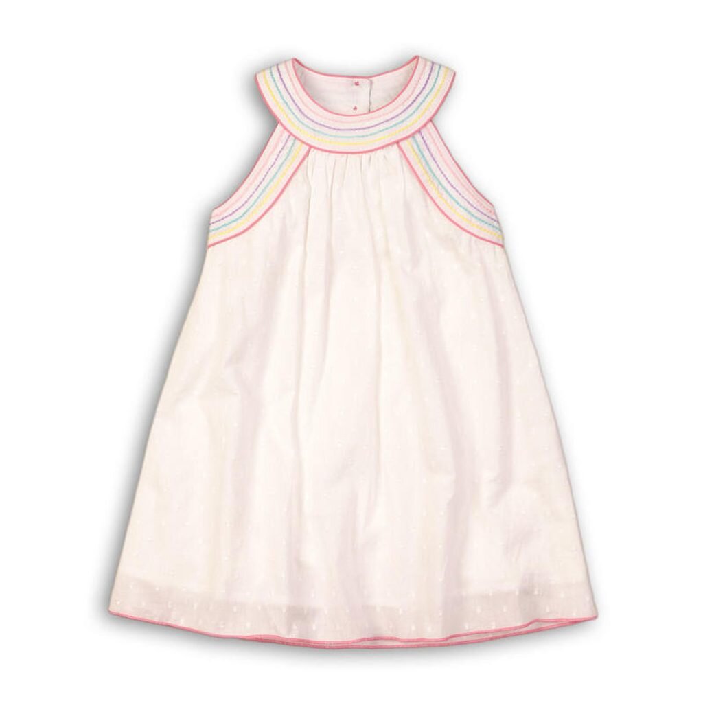 Dívčí bílé bavlněné šaty bez rukávů s barevným vyšíváním kolem lemu, vzadu na knoflíky. przeczytaj całość