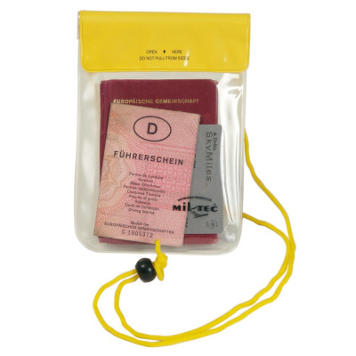 Wodoszczelne etui od Mil-Tec. Wodoszczelne etui z możliwością zawieszenia na szyję do przechowywania wrażliwych przedmiotów przed wodą, kurzem itp. Etui ma wodoszczelne zamknięcie na rzep. Nadaje się do przechowywania paszportu, dokumentów podróżnych lub np. mapy. Parametry wodoszczelnego etui rozmiary: 13 x 20 cm wodoszczelne rzep przezroczyste sznurek na szyję