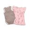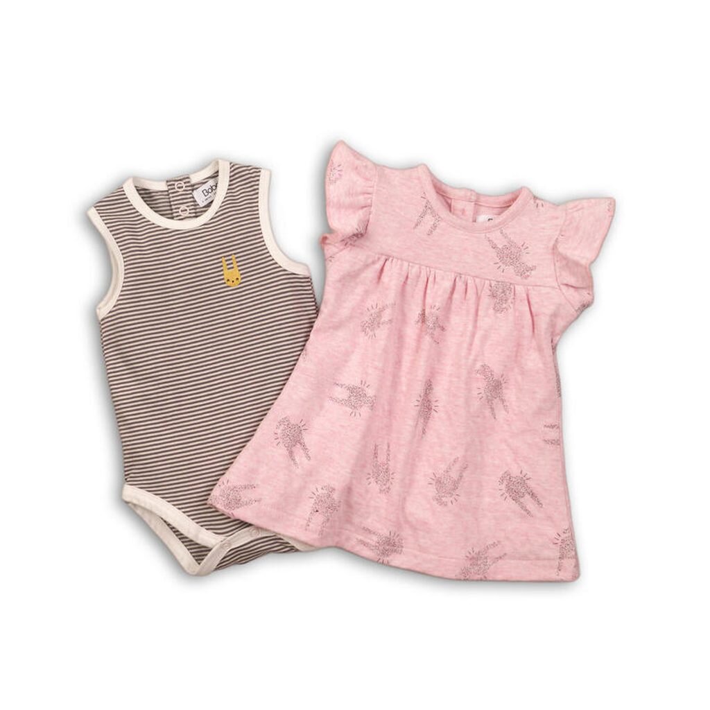 Dívčí set, který se skládá z dvou kusů oblečení a to šatů a body. Body je v béžové barvě s hnědými proužky a šaty v růžové barvě. przeczytaj całość