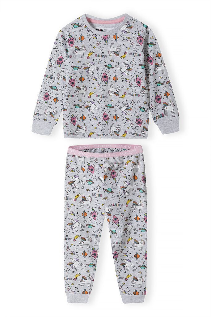 Dívčí pyžamová souprava s celoplošným potiskem má horní díl s dlouhými rukávy a dlouhými nohavicemi s elastickým pasem a elastickými manžetami na nohavicích.Vrchní a spodní díl: Složení: 100% bavlna. Manžety: 98 % bavlna, 2 % elastan. przeczytaj całość