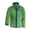 Dziecięca rozpinana futerkowa bluza w zielonym kolorze. Stojący kołnierz, dwie kieszenie, kontrastowe kolorowe obszycia.