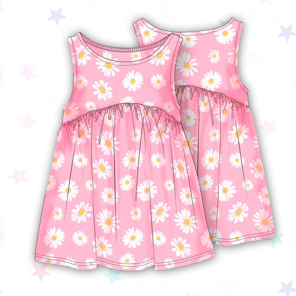 Dívčí růžové šaty na ramínka s celoplošným potiskem sedmikrásky. przeczytaj całość