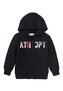Bluza z kapturem, zapinana na zamek błyskawiczny, z przednimi kieszeniami i centralnym nadrukiem.