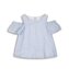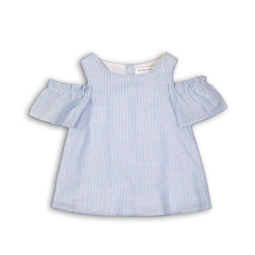 Bavlněná dívčí halenka na ramínka se spadlými volánkovými rukávy. Vzadu zapínání na knoflíky. Barva bílá s celoplošnými modrými proužky. Střih do písmene A. przeczytaj całość