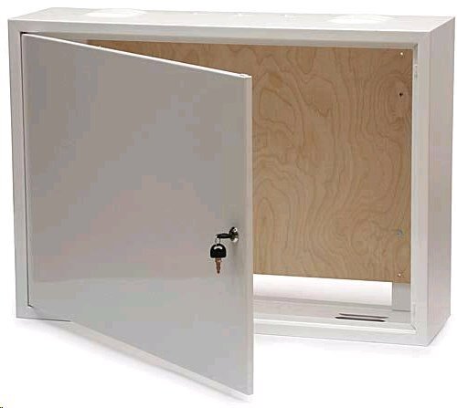 Montážní ochranná skříň uzamykatelná pro TV, SAT nebo WIFI prvky. Skříň je vyrobena z pozinkovaného materiálu proti zrezivění s povrchovou úpravou bílé barvy. Po odstranění krytek získáme otvory pro kabeláž na horní a spodní straně.