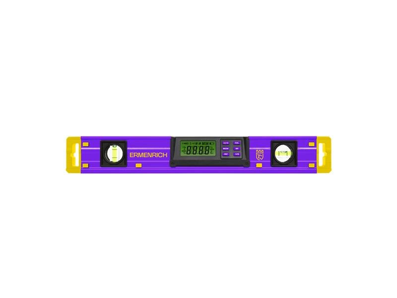 Digitální vodováha Ermenrich Verk LY40 je kompaktní nástroj, který kombinuje funkce digitálního úhloměru a standardní bublinkové vodováhy. Vodováha je určena pro stavební a opravárenské práce, vyrovnávání při montáži a uvádění do provozu a přesné polohování obrobků na kovoobráběcích a dřevoobráběcích strojích. Přístroj lze použít v každodenním životě – při montáži a upevňování nábytku na stěnu, záclonových tyčí a dalších konstrukčních prvků. Vodováha měří sklon objektu v rozsahu 0–360° ve čtyřech směrech a výsledky zobrazuje na LCD displeji. Nabízí měření ve stupních, procentech, mm/m a in/ft.