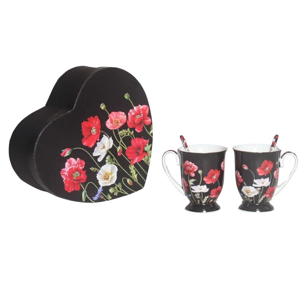 HOME ELEMENTS Sada dvou šálků 280 ml se lžičkami, Máky černé