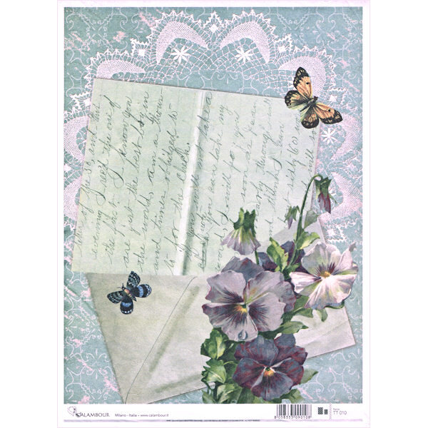 Papier ryżowy do decoupage. wymiary netto 309 x 233 mm,wzór - tło serweta, list, pismo ręczne, - kwiaty bratki, motyle. przeczytaj całość