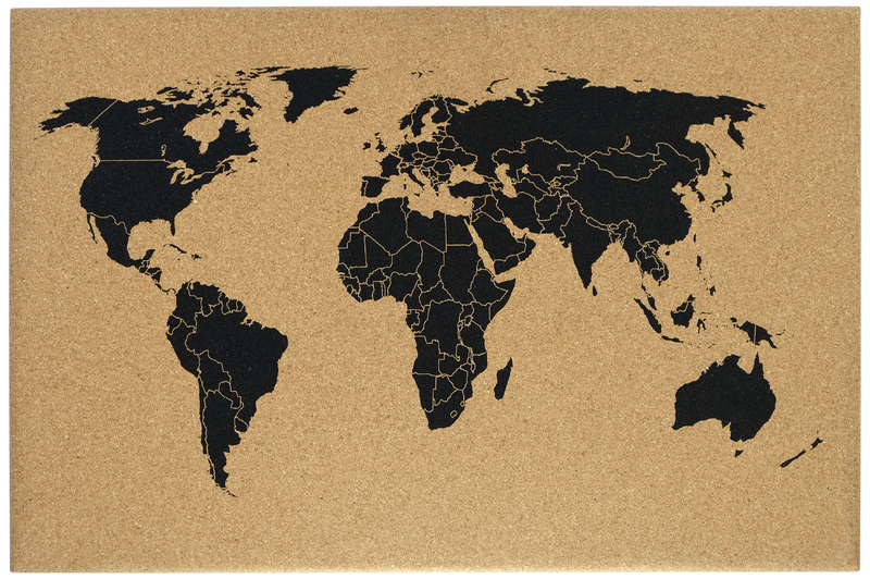 Tablica korkowa 60 x 40 cm bez ramy z nadrukiem czarnym Mapy Świata, MemoBe
