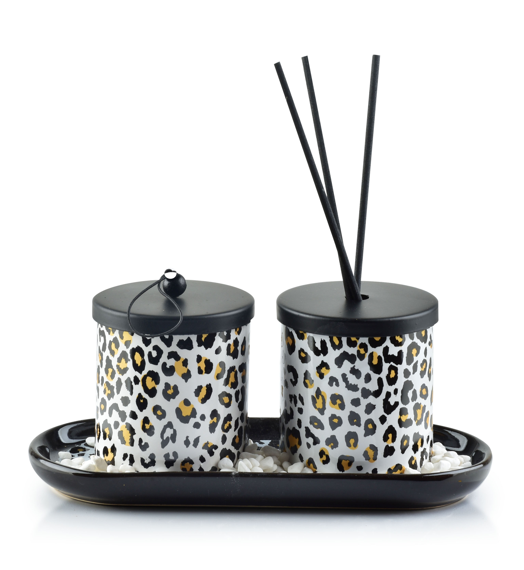 Zestaw zapachowy marki MONDEX since 1986.Nadaj piękny zapach swojemu domowi lub spraw radość swoim bliskim. Zestaw prezentowy we wzór pantery. Odpowiednio dobrany zapach do wnętrz uspokaja i zapewnia dobry nastrój, sprawiając, że każde pomieszczenie staje się komfortowe i przytulne.Właściwości:...