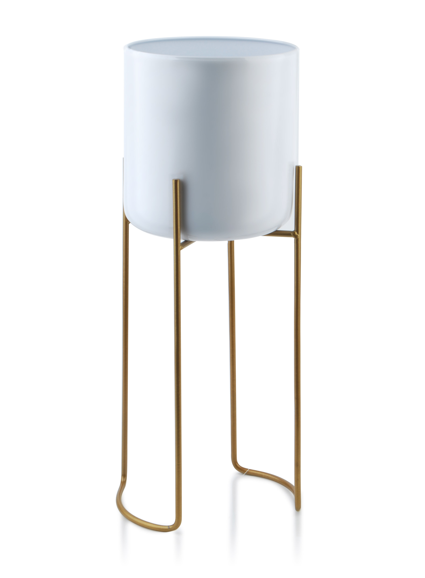 SWEN osłonka na stojaku marki Mondex. Wykonana z metalu w kolorze białym. Jest osadzona na stojaku w kolorze złotym. wymiary całości: długość: 20cm szerokość: 20cm wysokość: 54cm wymiary doniczki: długość: 18.7cm szerokość: 18.7cm wysokość: 20cm przeczytaj całość