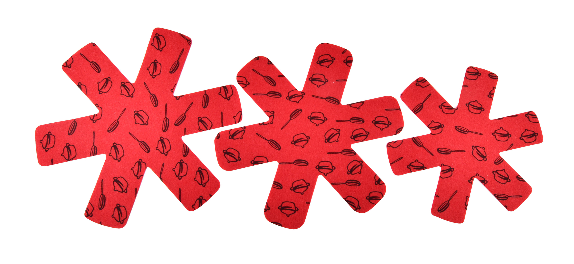 Komplet czerwonych przekładek do patelni/garnków 3szt. marki COOKINI by MONDEX. Wykonane z filcu z wzorem w garnki i patelnie w kolorze czarnym. Innowacyjne przekładki chronią przechowywane patelnie z powłoką typu non-stick przed zarysowaniem, gdy są ułożone jedna na drugiej....