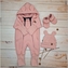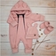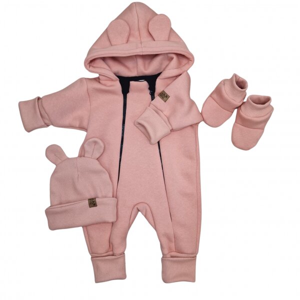 Oteplený dětský overal bez šlapek s kapucí, čepička + botičky, 3D, koralový, vel. 74; 74 (6-9m)