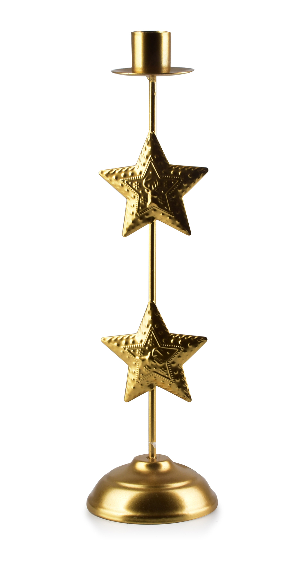 Metalowy świecznik na świecę stołową w kolorze złotym z serii SANTA LILA marki MONDEX. W środku świąteczego świecznika znjadują się 2 zdobione, ryflowane gwiazdy. Każde wnętrze nabierze niepowtarzalnego klimatu....