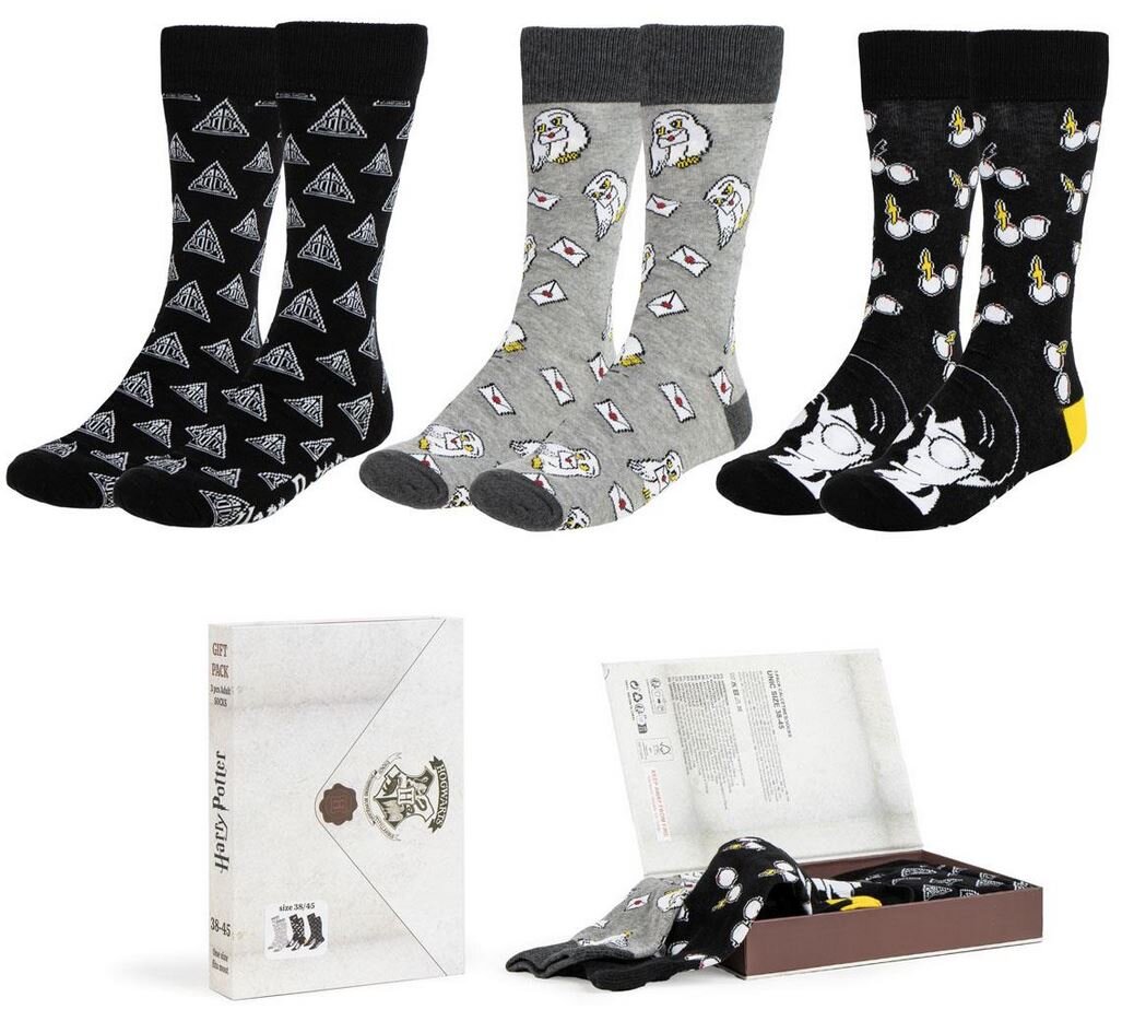 Opakowanie trzech par męskich skarpetek, inspirowanych sagą o Harrym Potterze.