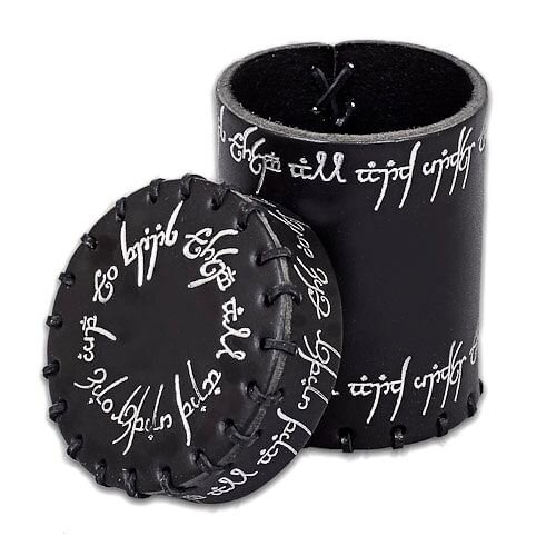 Kožený kelímek na kostky s víčkem, vyrobený ze 4 mm hrubé kůže obarvené na černo, velikost 7x8 cm. Je zdoben stříbrným elfským písmem známým z Tolkienova Pána prstenů. Písmo je do kůže vyraženo a stříbrně nabarveno, takže vydrží mnohé zacházení! Kelímek je skvělý kupříkladu pro dokreslení... przeczytaj całość
