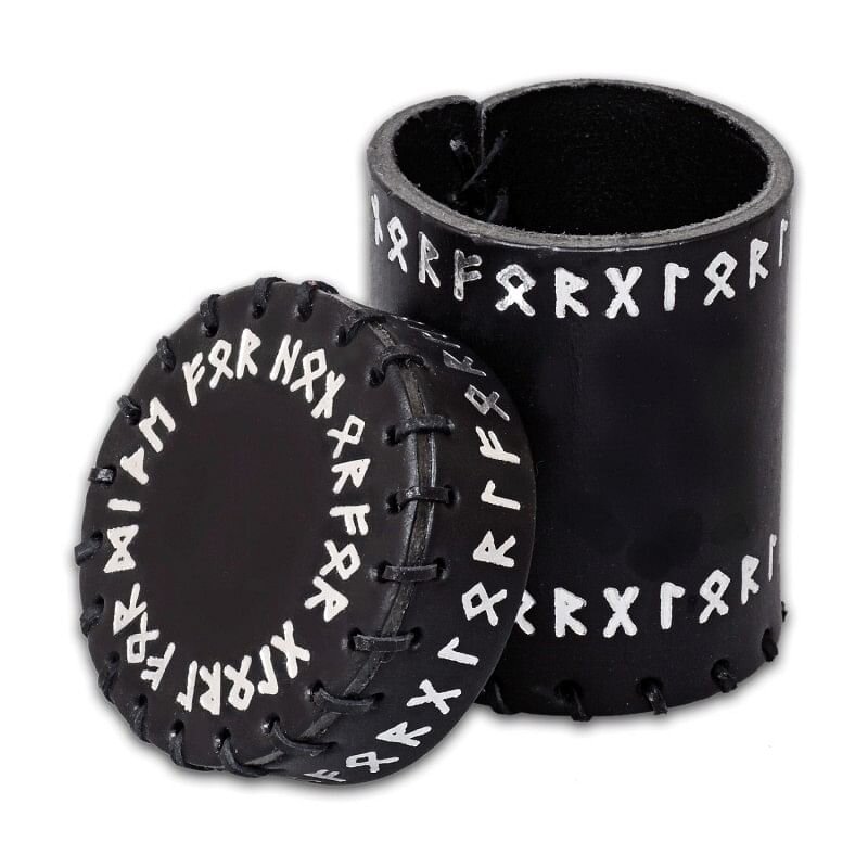 Kožený kelímek na kostky s víčkem, vyrobený ze 4 mm hrubé kůže obarvené na černo, velikost 7x8 cm. Je zdoben stříbrnými trpasličími runami známými z Tolkienova Pána prstenů. Runy jsou do kůže vyraženy, takže vydrží mnohé zacházení! Kelímek je skvělý kupříkladu pro dokreslení atmosféry při hraní... przeczytaj całość