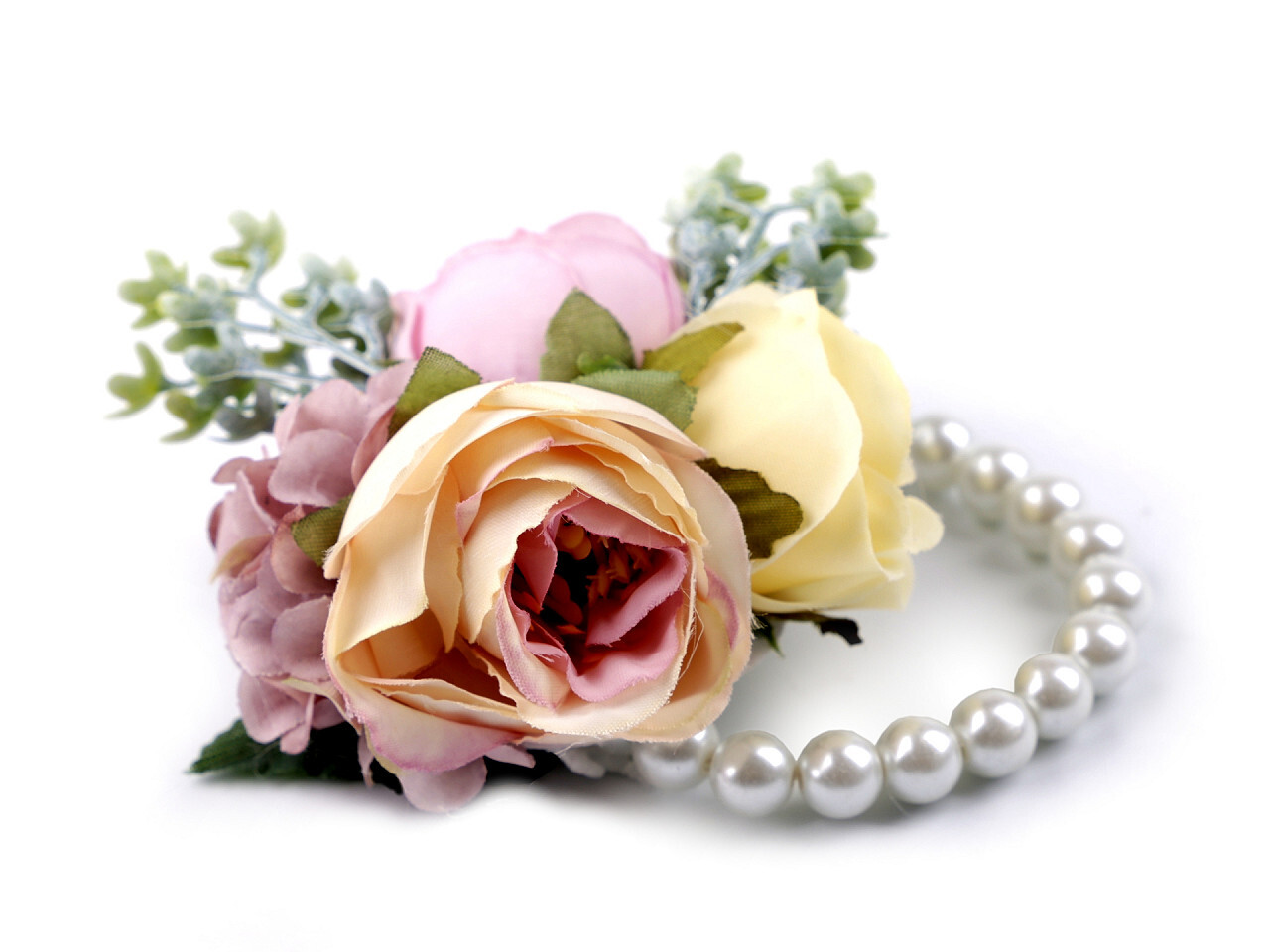 Perlový náramek s růžičkami je určený především pro svědkyni, družičky, maminku nebo jen tak. Potěší všechny ženy, které se rády zdobí romantickými doplňky. Je pružný, má univerzální velikost. Ve středu jsou 3 růžičky doplněné malou hortenzií, bobulemi, větvičkami a listem.