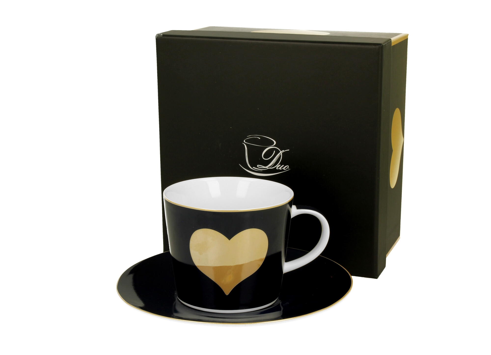 Filiżanka ze spodkiem Granatowa - WIELKIE SERCE wchodzący w skład serii SERCA, wykonana z porcelany New Bone China, charakteryzującej się elegancką i naturalną kremowo - białą barwą z delikatnym połyskiem, a także wyjątkową wytrzymałością.Filiżanka zdobiona wzorem ogromnego złotego serca na...