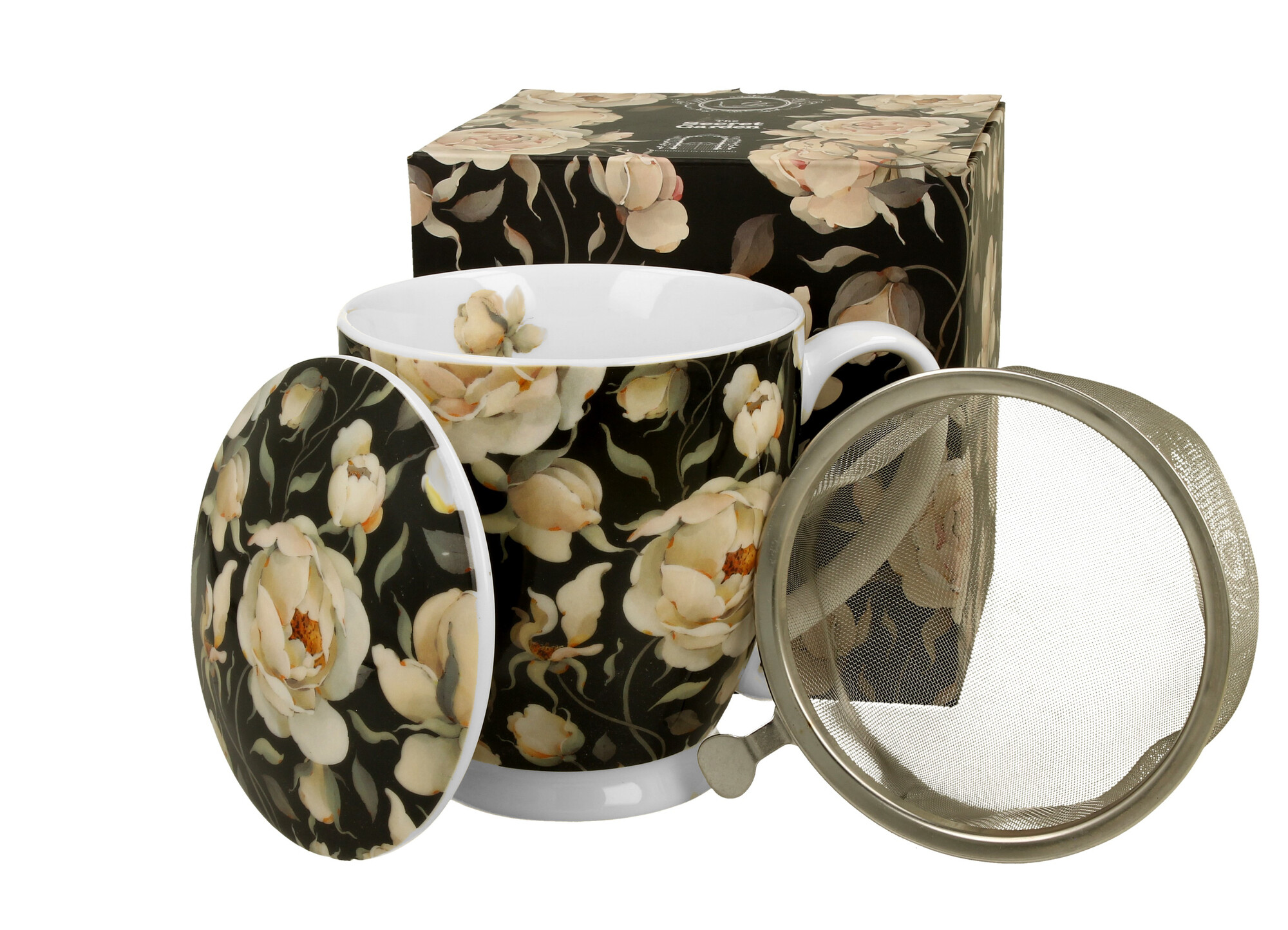 Kubek z zaparzaczem na stopce ENGLISH ROSES BLACK wchodzący w skład serii Kwiaty Royal, wykonany z porcelany New Bone China, charakteryzującej się elegancką i naturalną kremowo - białą barwą z delikatnym połyskiem, a także wyjątkową wytrzymałością.Linia zdobiona motywem pędów angielskich róż w...