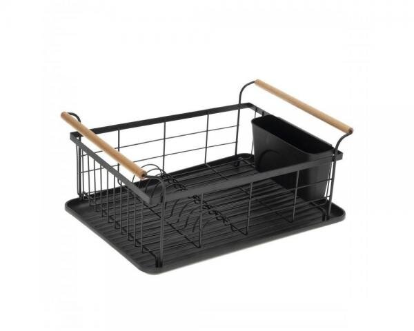 Sada obsahujekovový odkapávač s dřevěnými držadly,jednokomorová nádoba na příbory,vyjímatelný zásobník na příbory.Informace:materiál: kov, dřevo,barva: matná černá,rozměry: výška:  18,50 cm, šířka: 31,5 cm, hloubka:  43 cm,prostor pro talíře: 10 žeber,nádoba na příbory: ano. przeczytaj całość