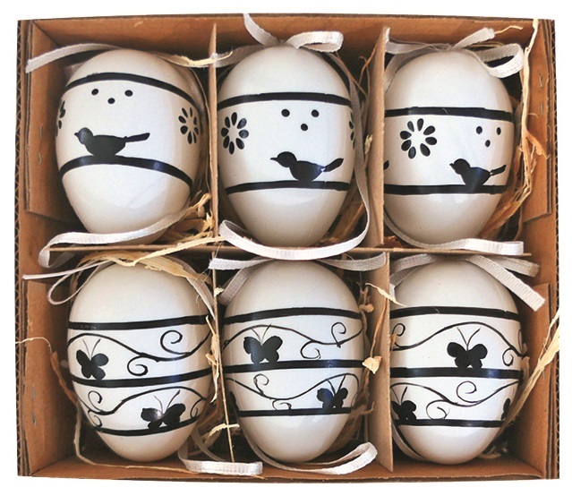 Plastová vajíčka s černým dekorem v krabičceVajíčka využijete k různým dekoračním či aranžérským účelům.Můžete s nimi ozdobit věnce či vazby, nebo je jednoduše zavěsit třeba na větvičku.Originální moderní design v černobílém provedení se hodí téměř do každého interiéru či exteriéru.Jedna sada...