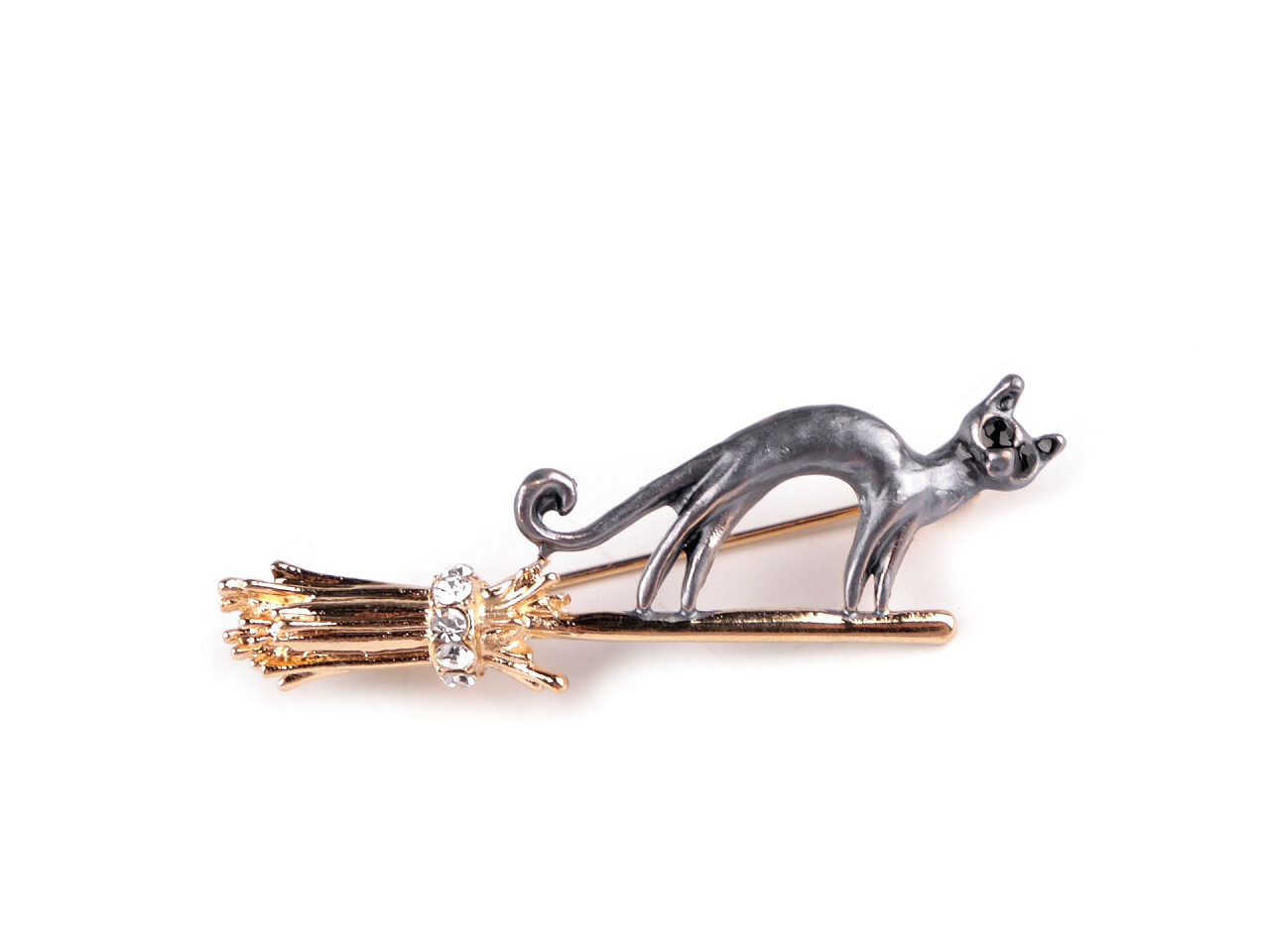 Brož kočka - 1 ks - 3 šedá ocelová zlatá