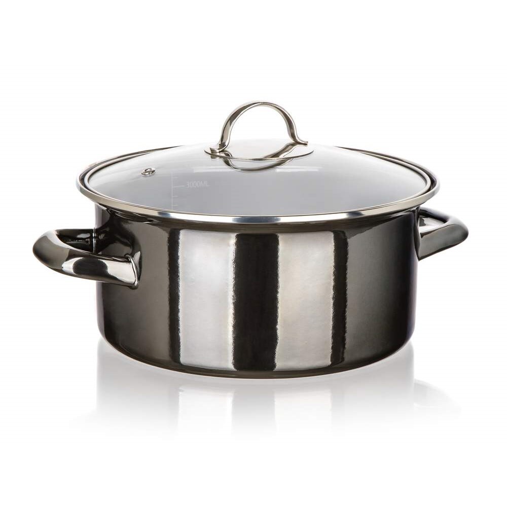Emaliowany garnek METALLIC Black 3,7 l, z szklaną pokrywą. Wymiary: średnica 22 cm, wysokość (bez pokrywki) 13 cm. Kolor: czarny metalik. Garnek można używać na wszystkich rodzajach płyt grzewczych, w tym indukcyjnych. przeczytaj całość