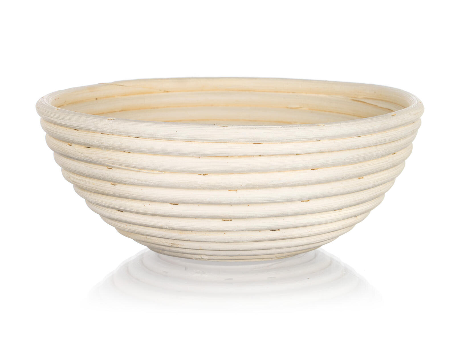 Okrągły koszyk z naturalnego pedigu z dekoracją w postaci kwiatuszka o wymiarach 21 x 7,5 cm przeznaczony jest do wyrastania chleba. Po użyciu zaleca się czyścić go tylko wilgotną ściereczką. przeczytaj całość