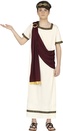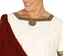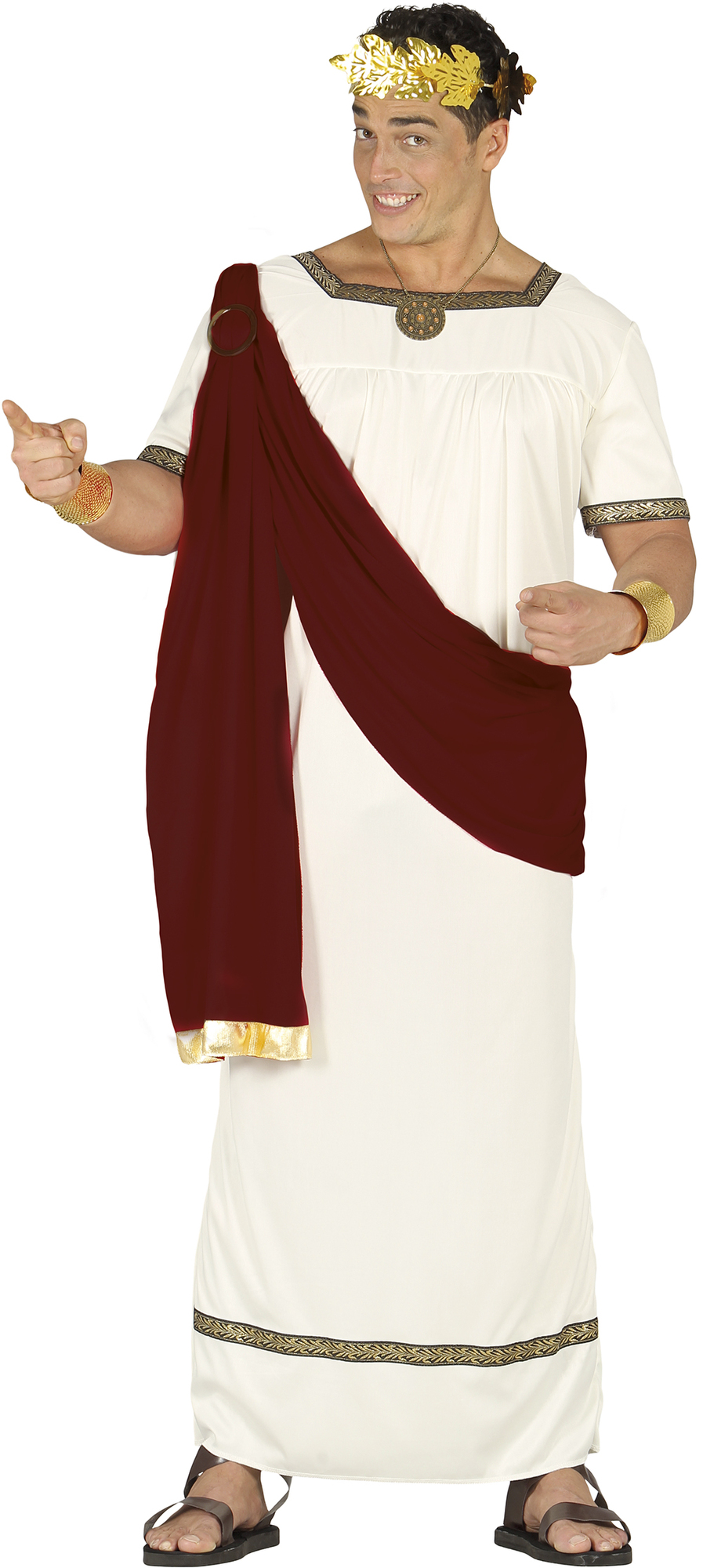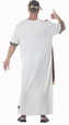 Historický kostým starověkého římana. Bílé šaty s ozdobními stužkami a šerpou. przeczytaj całość
