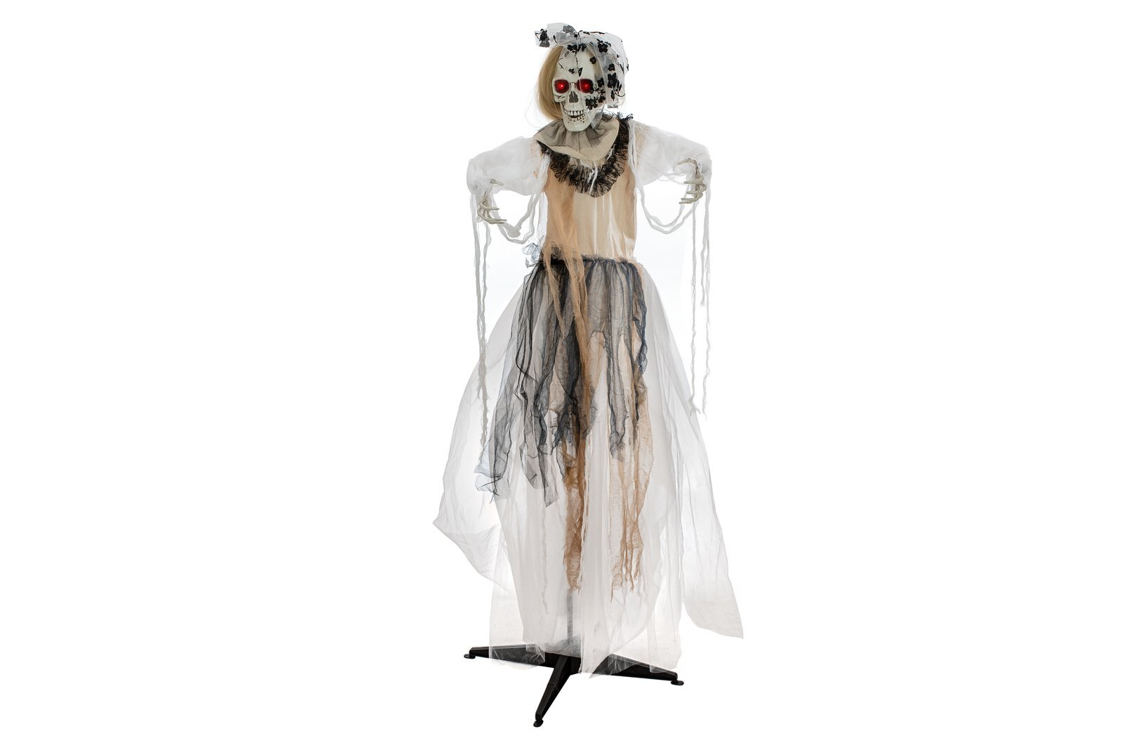 Przeraź swoich gości ruchomą postacią szkieletu panny młodej, która nadal ma na sobie suknię ślubną, a włosy związane wstążką. Gdzie jednak jest pan młody, dla którego się tak wystroiła? Rozkłada bezradnie ręce w górę i w dół, jęczy płaczliwym głosem nad nieobecnością pana młodego, kręci głową tam i z powrotem, a w oczach migają jej czerwone diody LED. Ruch postaci można aktywować za pomocą wbudowanego mikrofonu, pedału "Postaw stopę tutaj" lub przewodowego pilota ręcznego. Zasilanie postaci może pochodzić z baterii lub z kabla USB-A podłączonego do powerbanku 5V lub zasilacza.