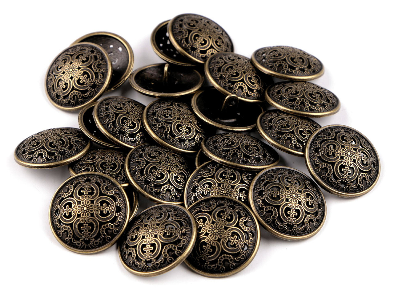 Metalowe guziki z filigranowym wzorem są wykonane ze stopu cynku i metali niemagnetycznych. Mają dolne oczko do przyszycia. Guziki elegancko prezentują się na płaszczach, marynarkach, koszulach itp. Interesująco ozdobią także torebki, torby lub kapelusze. Guziki są pakowane w woreczku. Rozmiar guzików znajdziesz w tej tabeli. Cynk chroni metal przed korozją. Ocynkowane wyroby po praniu pozostają bez zmian.