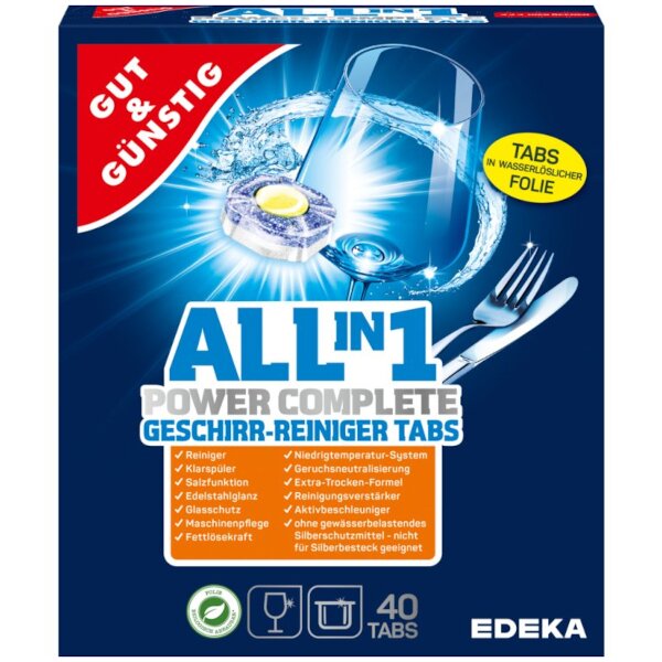 GG All in One Tablety do myčky 40 ks - rozpustná fólieKvalitní a vysoce účinné tablety do myčky s MULTI fázovým systémem - zajišťují bezchybný výsledek mytí a odstraňují silně odolné zbytky jídel a nečistot. Pro lesk beze skvrn, chrání sklo, nerez a stříbro.1 tableta = 21 gVarování Varování:...