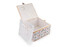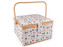 Większy tapicerowany koszyk na przybory do szycia doceni każda krawcowa. Na wewnętrznej stronie pokrywki koszyk ma igielnik i kieszonkę. Ponadto dostępna jest plastikowa przegroda z wieloma przegródkami, w które można uporządkować przybory do szycia. Przegrodę można łatwo wyjąć. Wysokość przegrody wynosi 3 cm. Koszyk ma zapięcie na magnes. Dzięki solidnemu uchwytowi można go łatwo przenosić.