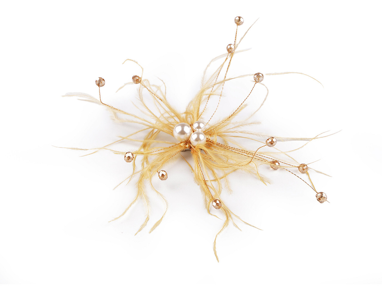 Péřová brož s perlami a broušenými korálky - 1 ks - 2 zlatá