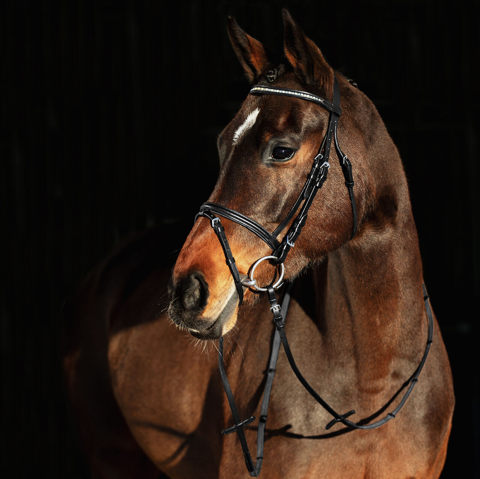 Každodenní tréninková uzdečka nemusí být obyčejná. Dodejte svému tréninku trochu koření díky stylovému výběru za dobrou cenu. Čelenka s kamínkovými cvočky dodává charakter této elegantně vypadající uzdečce. Zvýšený polstrovaný úzký nánosník doplňuje mnoho plemen a pogumované otěže jsou příjemným bonusem pro lepší přilnavost.