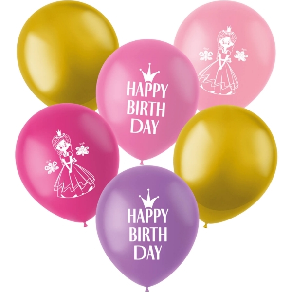 Zestaw sześciu lateksowych balonów o tematyce księżniczek. Te balony świetnie sprawdzą się na przyjęciu urodzinowym w stylu księżniczek. Balony mają 33 cm i można je nadmuchać powietrzem lub helem. Przy napełnianiu helem latają bez użycia środka przedłużającego lot (gelu) przez około 12-14 godzin. Materiał: lateks Rozmiar: 33 cm Pojemność jednego balonu: 18 l Ilość w opakowaniu: 6 szt. Opakowanie handlowe: Tak