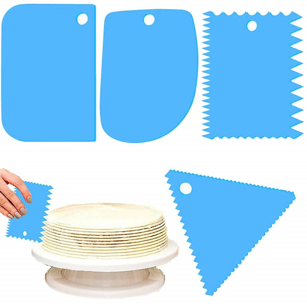 Zestaw 4 sztuk szpatułek cukierniczych do tortu do łatwego tworzenia różnych struktur kremu lub ciasta. Silikonowy materiał szpatułek kuchennych zapewnia elastyczność i uniwersalne zastosowanie - wygładzanie kremu, krojenie ciasta, szpatułka do podbierania warzyw oraz dekorowanie potraw. Zawiera trójkątną szpatułkę z ząbkami, dwie prostokątne szpatułki z ząbkowanymi i zaokrąglonymi krawędziami oraz szpatułkę z zaokrąglonymi krawędziami.