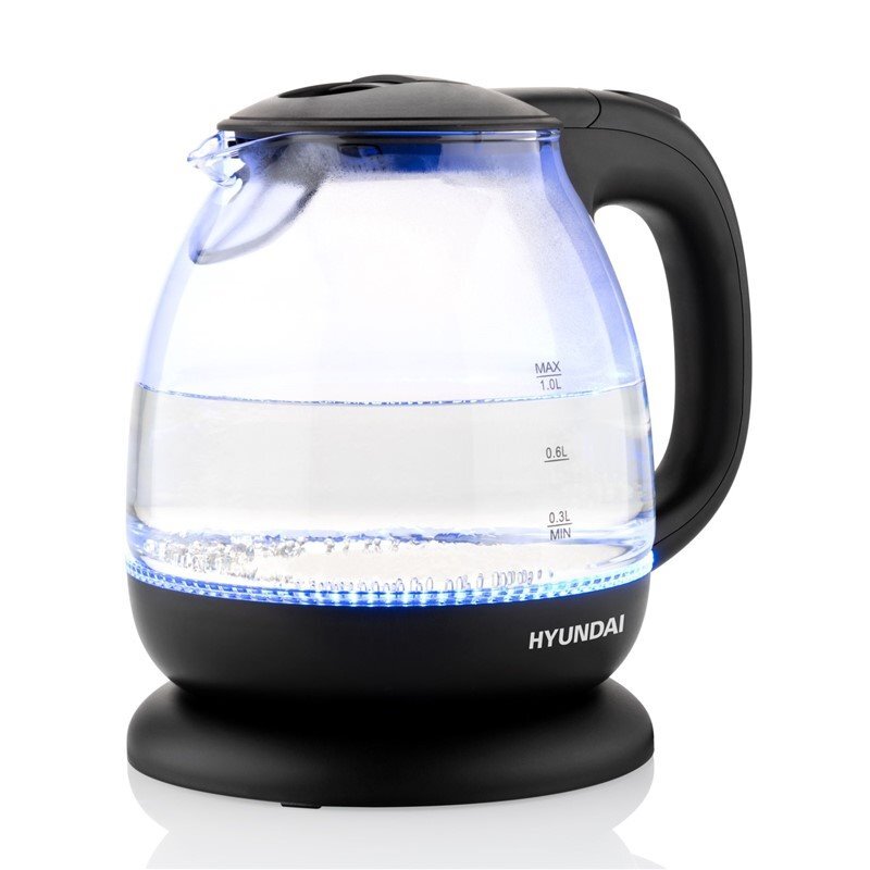 Hyundai oferuje elegancki czajnik o mocy 1 100 W z wewnętrznym podświetleniem. Dzięki dużej mocy nie musisz długo czekać, aż woda zagotuje się na filiżankę porannej kawy. Wewnętrzne oświetlenie czajnika dodaje niestandardowego elementu, który docenisz podczas gotowania wody. Urządzenie wyposażone jest w automatyczny system wyłączania. Gdy woda osiągnie punkt wrzenia, czajnik wyłączy się samoczynnie. Możesz w nim zagotować jednocześnie do 1 l wody. Na boku czajnika znajduje się wskaźnik poziomu wody, dzięki któremu masz kontrolę nad ilością wody w urządzeniu. Element grzewczy, który podgrzewa wodę, jest ukryty pod płaskim, stalowym dnem. Dzięki temu czajnik jest bardzo łatwy do czyszczenia.