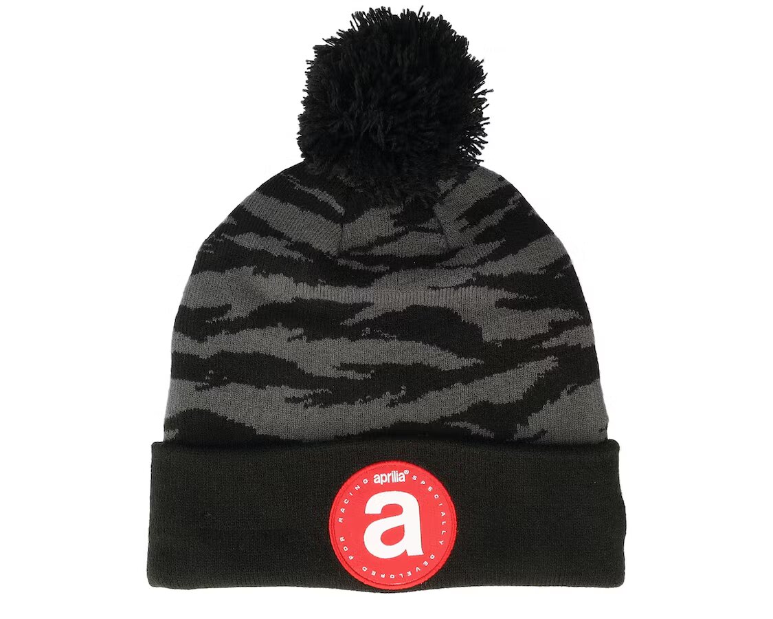 Stylová zimní čepice Aprilia s bambulí. Černá zimní čepice Aprilia Racing s vyšitými logy. Zahřeje, pohodlná na nošení. przeczytaj całość