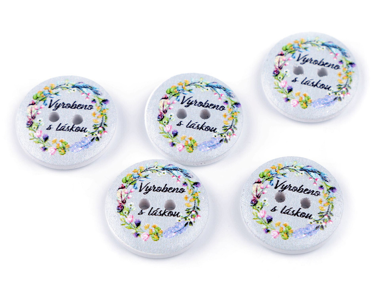 Dřevěné dekorační knoflíky zdobí květinový potisk a nápis "Vyrobeno s láskou". Vyniknou na ručních výrobcích, dárcích a různých dekoracích. Můžete je použít také ve scrapbookingu. Motiv je jednostranný. przeczytaj całość