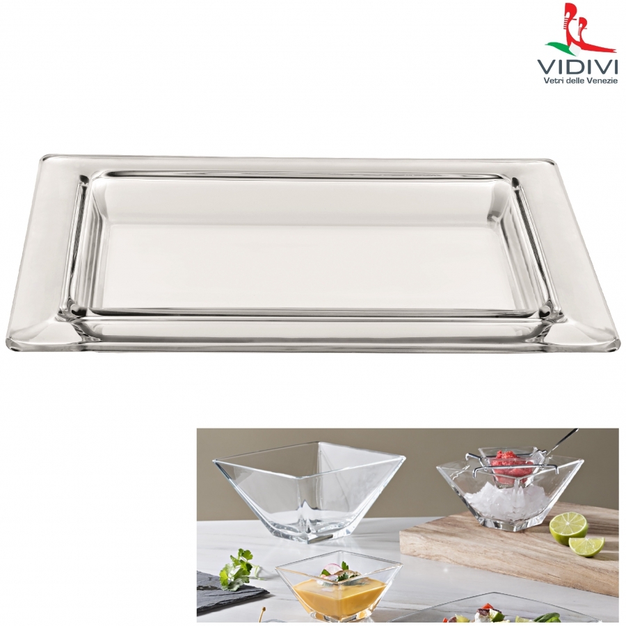 VIDIVI, skleněný podnos TORCELLO, 40 x 30 cmSkleněný servírovací podnos v jedinečném čtvercovém designu s jemnými geometrickými tvary. Je ideální pro servírování kávy, zákusků, na dezerty atd. Je vyrobený z kvalitního luxusního italského skla(sklo z Benátek) s vysokým stupněm transparentnosti,...