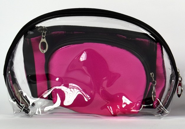 Průhledná taška má rozměr 26 x 8 x 15 cm, střední taštička s pruhy má rozměr 19 x 3,5 x 12 cm a nejmenší celozlatá má rozměr 15,5 x 4 x 10 cm.