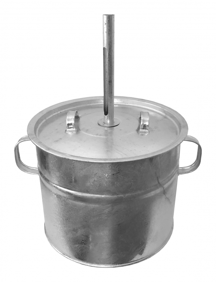 Ocynkowany garnek do przetworów REX o pojemności 20 l zawiera garnek, który ma wyjmowaną dystansową wkładkę, pokrywę i futerał na termometr.
