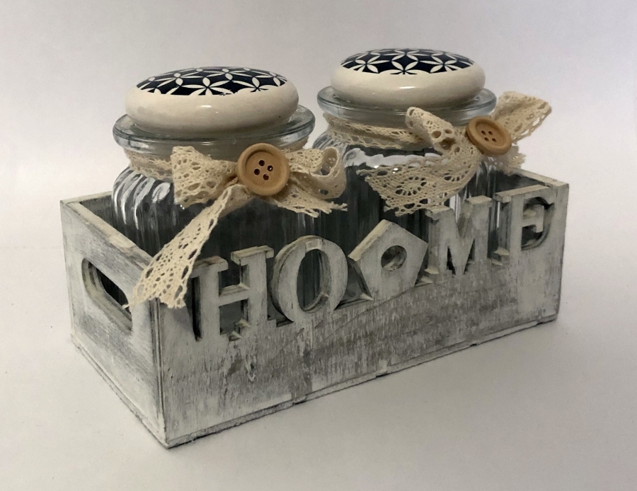DUE ESSE, Sada 2 ks dóz HOME s víkem, dekor č.3Sada 2 ks dóz s víkem HOME v dřevěné přepravce může sloužit jako dóza nebo jako kořenka. Dóza je skleněná s porcelánovým víkem se silikonovým těsněním. Dóza má průměr 8 cm a je 11 cm vysoká. Rozměr celé sady - šířka je 18 cm, výška 11 cm a hloubka 10... przeczytaj całość