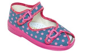 Obuwie dziecięce sandałki zapinane na dwie klamerki w groszki. Regulowane zapięcie pozwala dopasować buty do każdej stopy. Odkryte palce umożliwiają lepsze oddychanie stóp. Wnętrze buta wykonane z tkaniny bawełnianej. Usztywniana piętka. Różowa elastyczna podeszwa wykonana z bezftalanowego...
